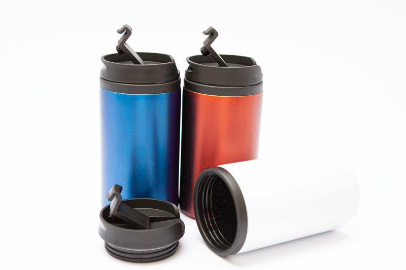 Auf den farbigen Bechern werden die Köpfe invertiert gelasert (wie blauer Musterbecher, Hintergrund wird weggelasert).